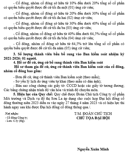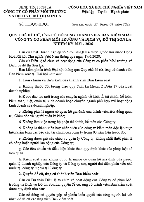 QUY CHẾ ĐỀ CỬ, ỨNG CỬ BỔ SUNG THÀNH VIÊN BAN KIỂM SOÁT CÔNG TY CỔ PHẦN MÔI TRƯỜNG VÀ DỊCH VỤ ĐÔ THỊ SƠN LA NHIỆM KỲ 2021 - 2026